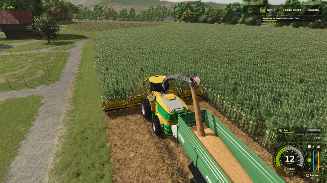 Plodinou zůstává obilí, protože mise na sečení zatím nejsou v FS25 k dispozici, dokud nebudou zavedeny oficiální smlouvy o pěstování pícnin.