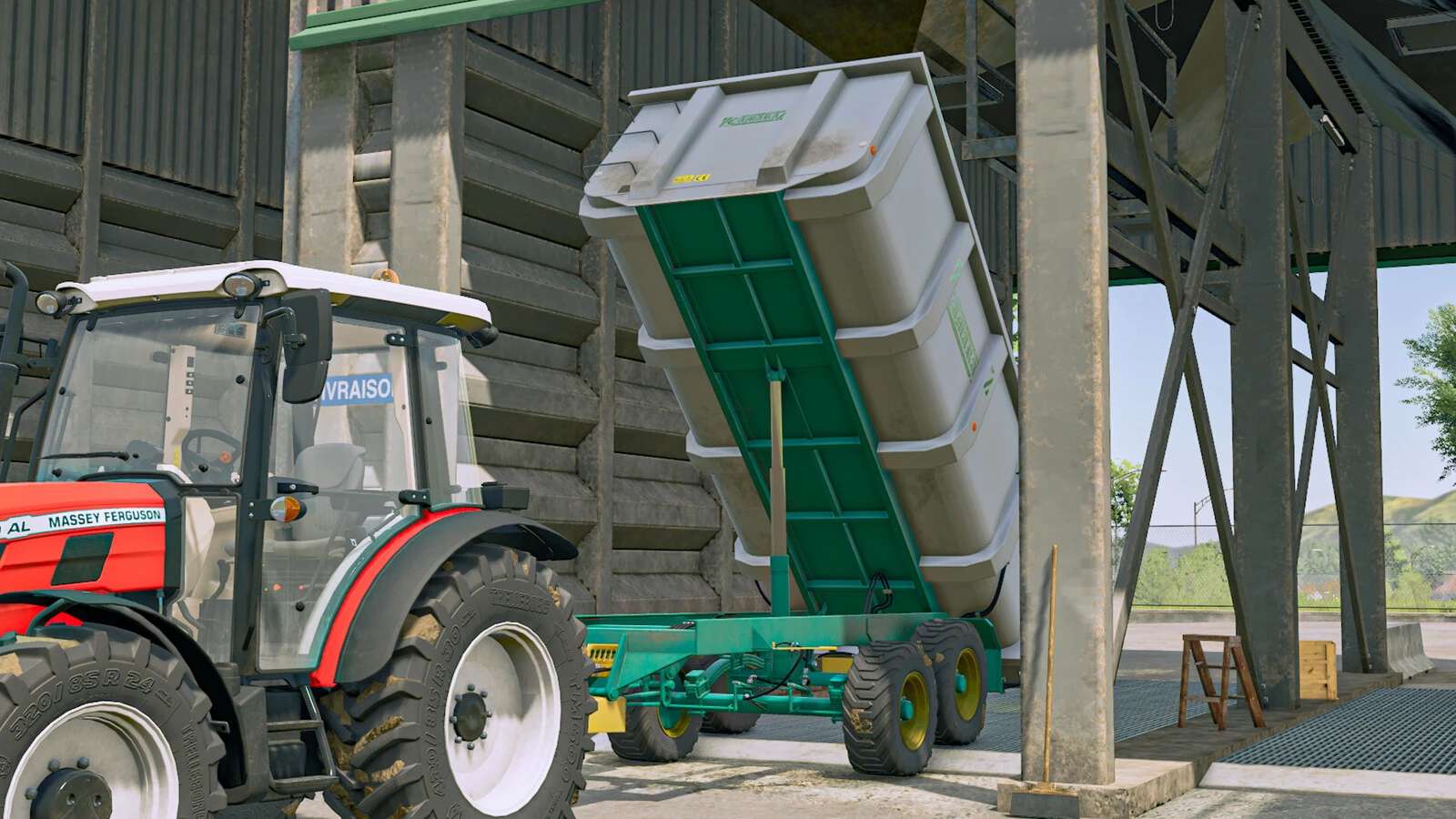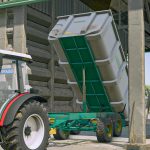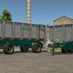 Sada jednonápravových sklápěcích návěsů z nerezové oceli, určených pro přepravu hroznů. Vybaveny širokými, nízkoprofilovými koly pro usnadnění vykládky ze sběračů hroznů a zvedacích návěsů.
