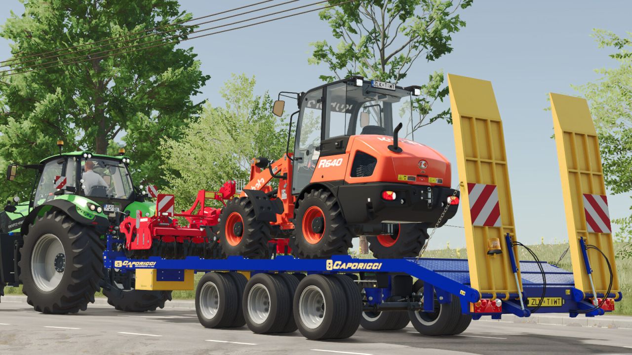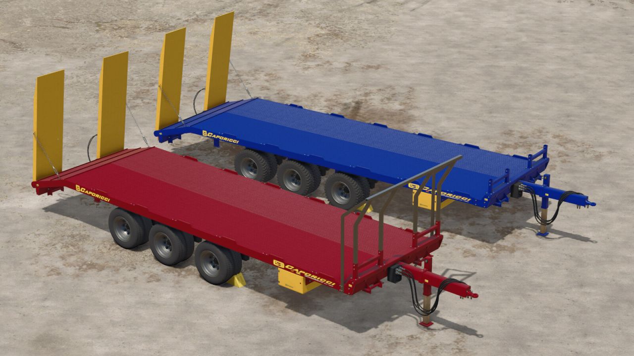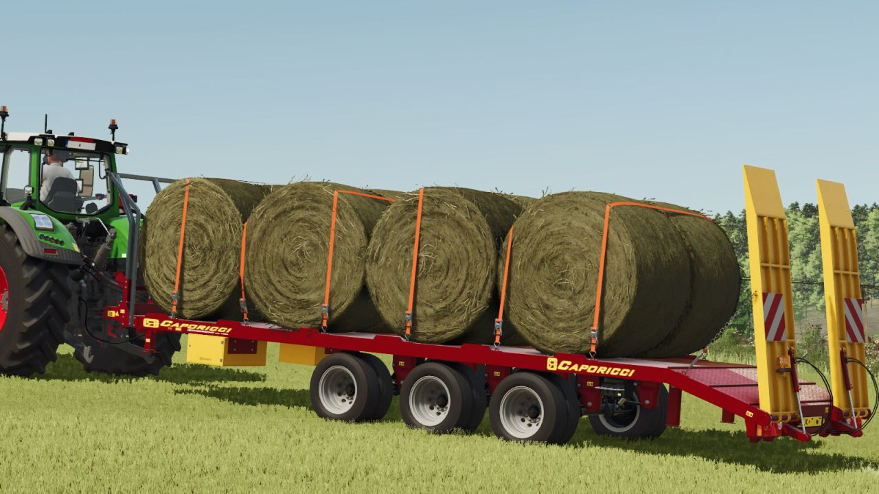 Přívěs Caporicci FC260CR pro přepravu pásových traktorů a balíků – tři nápravy a dvojitá kola – celková nosnost 200 metrických centů. Hmotnost 5 900 kg – délka 9 m – šířka 2,50 m – volitelné automatické nebo ruční nakládání.