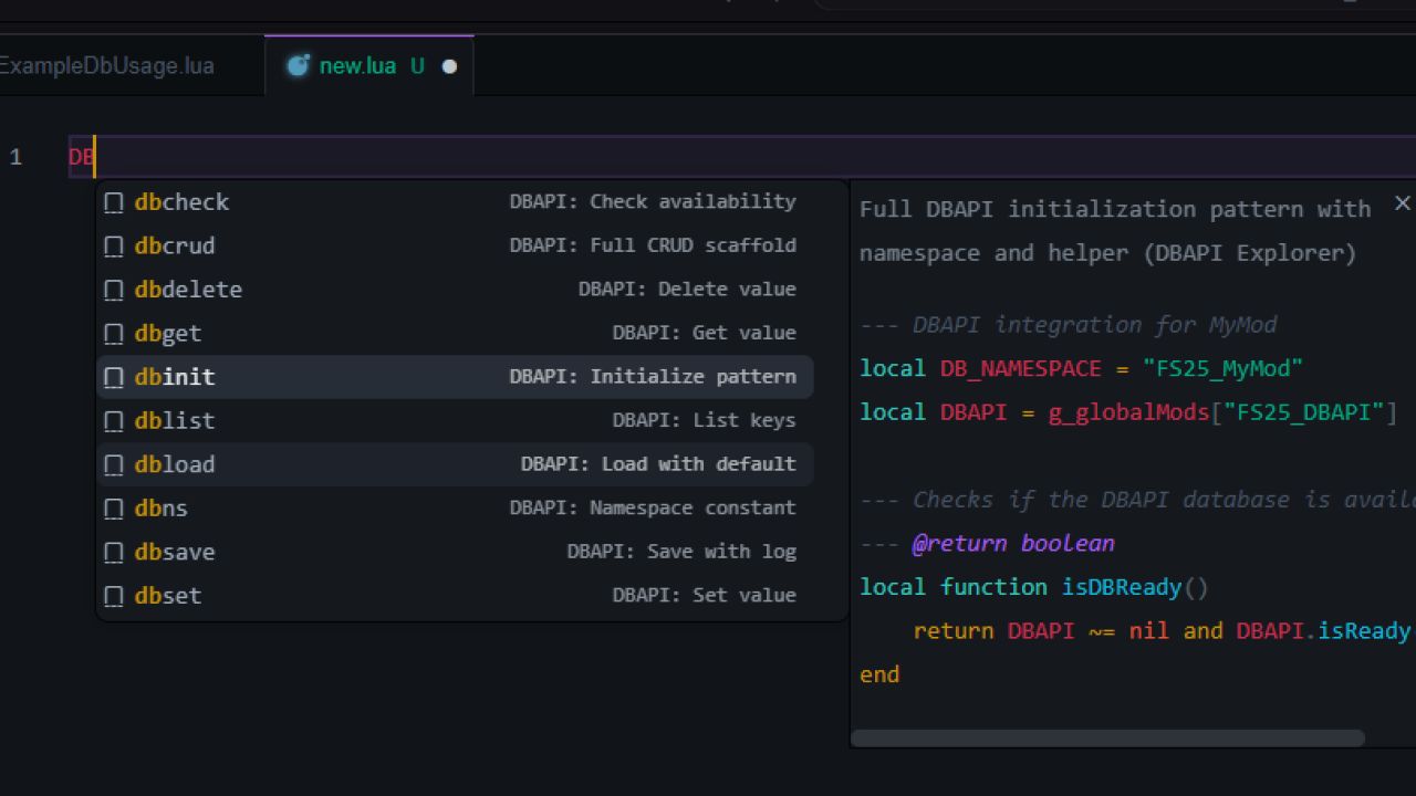 FS25_DBAPI je zjednodušená vrstva perzistence pro mody Farming Simulator 25. Nahrazuje fragmentované zpracování dat centralizovanou FlatDB podporovanou JSON a poskytuje jednoduché globální API (g_globalMods["FS25_DBAPI"].DBAPI) pro ukládání klíčů/hodnot v jmenném prostoru.