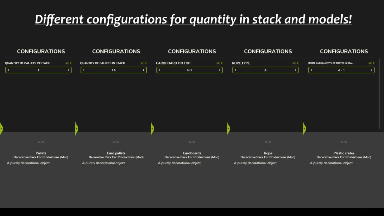 Použijte tento balíček dekorací k ozdobení vaší farmy, produkčních bodů nebo čehokoli, co chcete na mapě.
