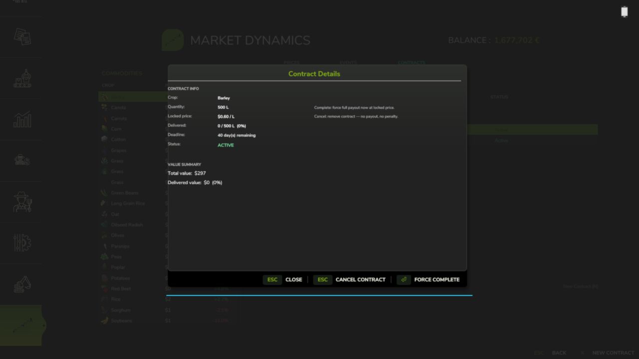 Futures kontrakty – zafixujte si prodejní cenu dnes s dodáním až do 120 herních dnů. Splňte včas pro vyplacení plné zafixované ceny; pokud termín zmeškáte, dostanete 15% pokutu za nesplněnou část. Pokud máte nainstalovaný FS25_UsedPlus, vaše kreditní skóre škáluje tuto pokutu mezi 10 % a 20 %.