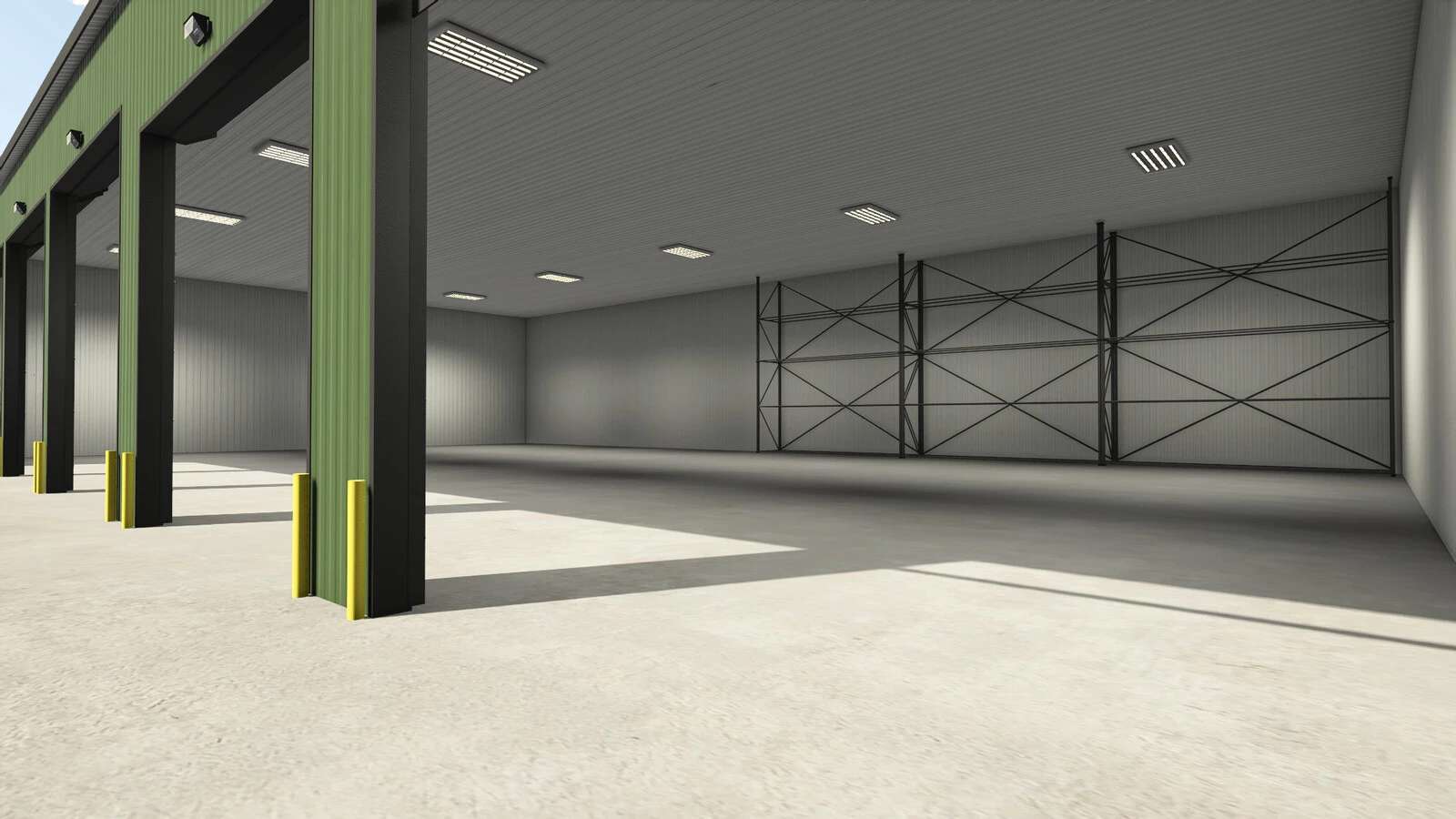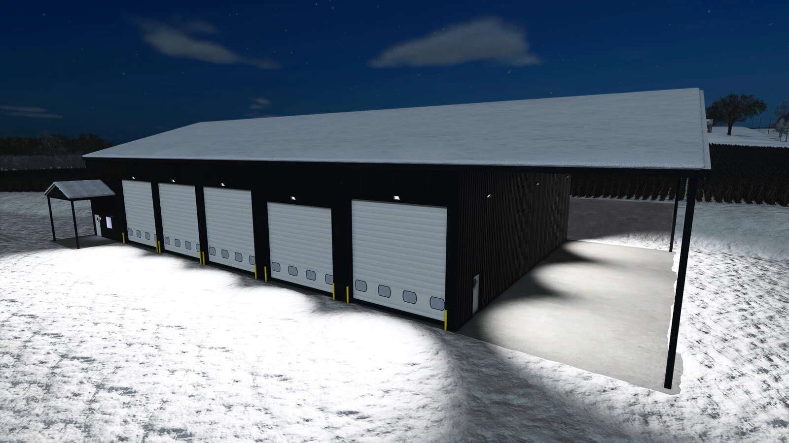 Garáž, kde můžete skladovat vozidla a plodiny. Uvnitř můžete využít police na palety nebo velké pytle.