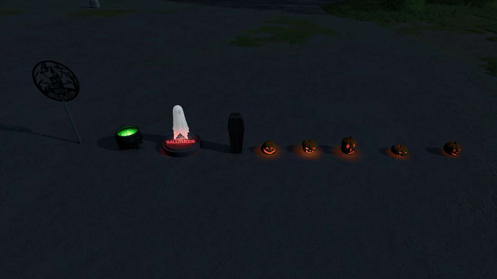 Halloweenský balíček s pěti dýněmi, rakví, kotlem, cedulí a osvětleným duchem. Generují peníze za hodinu.