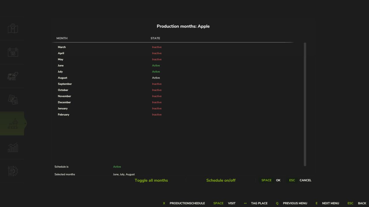 Měsíce lze aktivovat nebo deaktivovat jednotlivě prostřednictvím integrované nabídky na obrazovce výroby. Výroba pak probíhá výhradně ve vybraných obdobích.