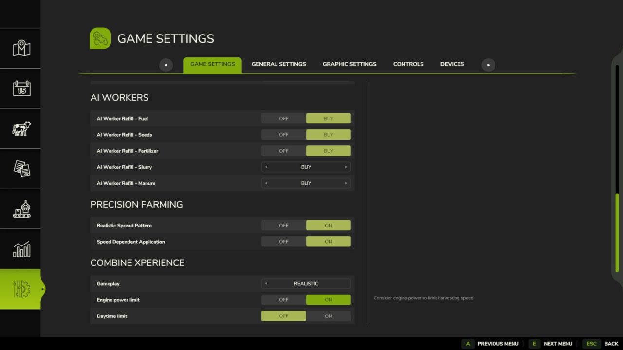 V nastavení hry jsou k dispozici speciální nastavení pro povolení/zakázání specifického chování pro vaše pohodlí a specifické parametry, jako je poloha HUDu, lze upravit v souboru combineXP.xml, který se nachází v modSettings.
