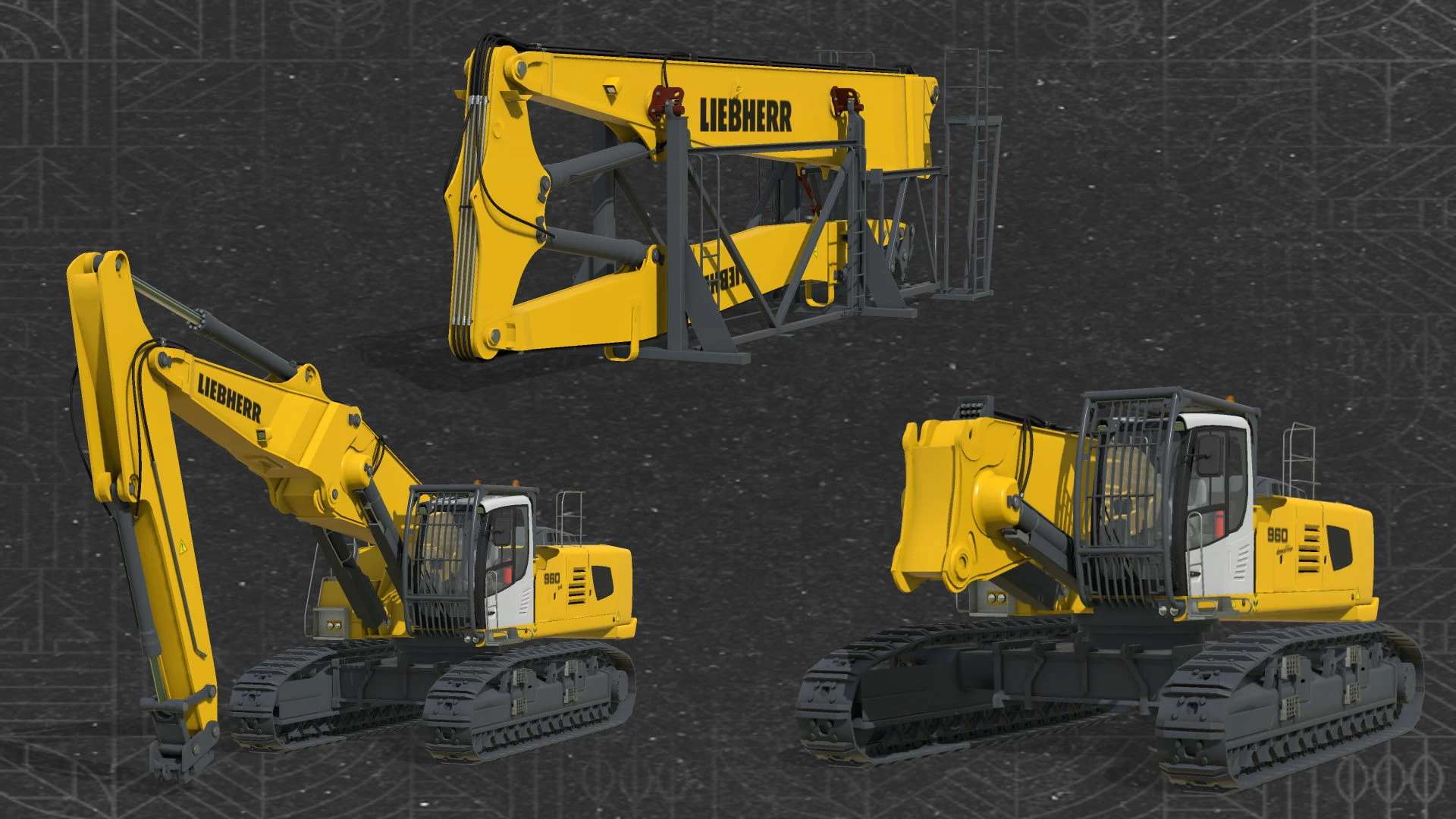 Toto balení obsahuje 2 verze rypadla Liebherr. R960 SME s pevným ramenem jako u standardních rypadel a R960 Demolition, ke kterému lze připojit výsuvné rameno. Na obě verze lze připojit veškeré příslušenství, které je součástí mé modifikace Excavator Attachments .