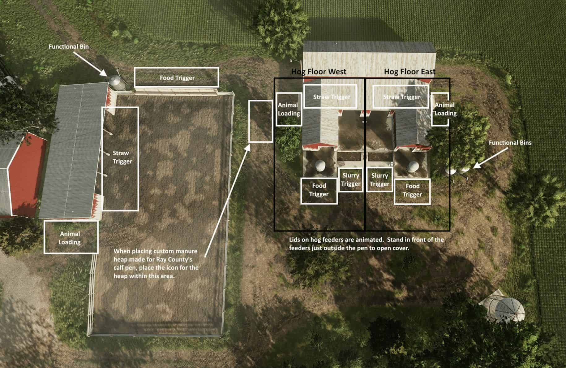 Mlýnek/míchačka, která je součástí mapy, je přizpůsobena požadavkům na krmivo pro prasata v okrese Ray a pro správnou funkci na této mapě nemusíte nic stahovat. Pokud byste chtěli používat mlýnek/míchačku na standardních mapách, které nemají vlastní krmivo, podívejte se v příštích několika týdnech na modifikace Green Acres.