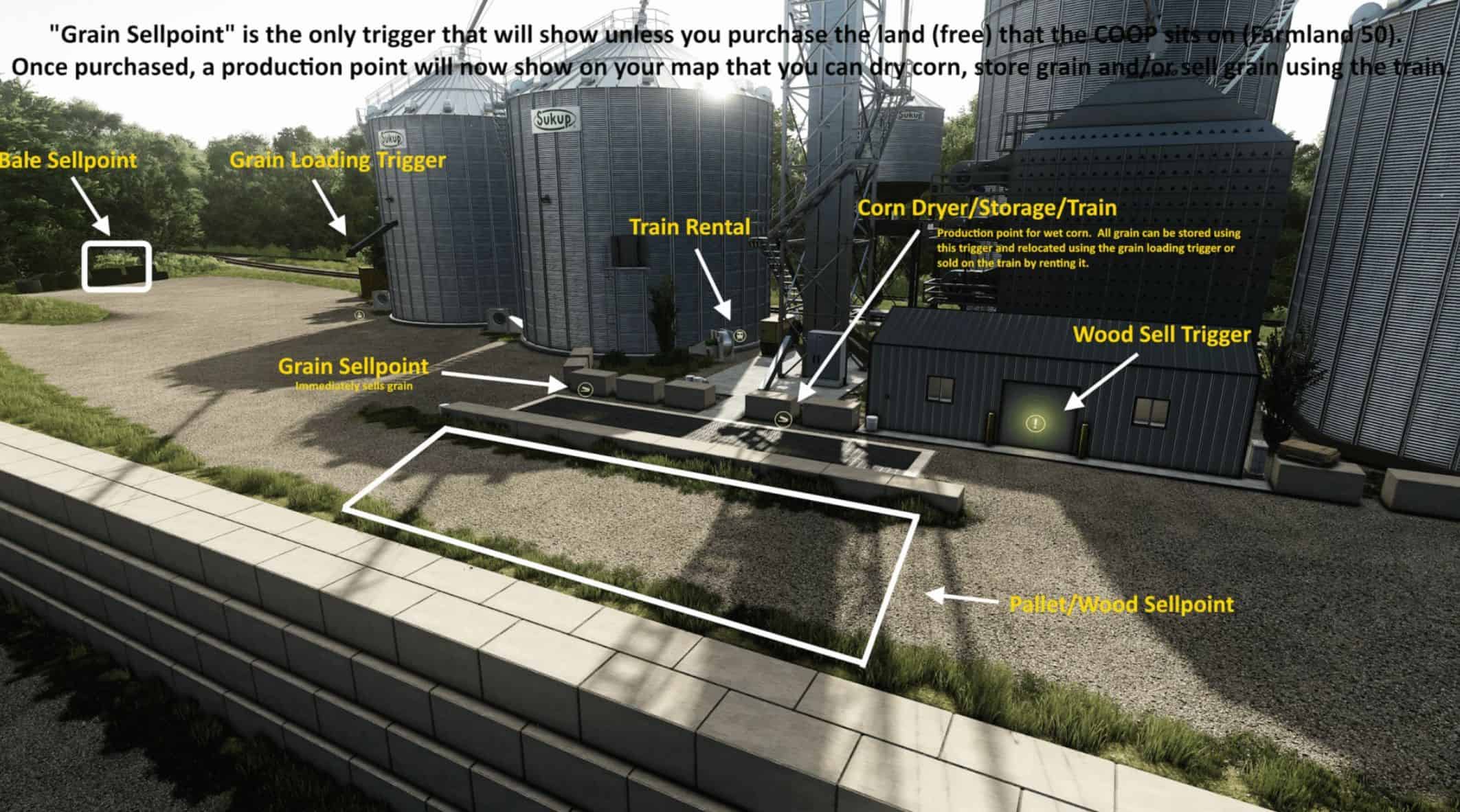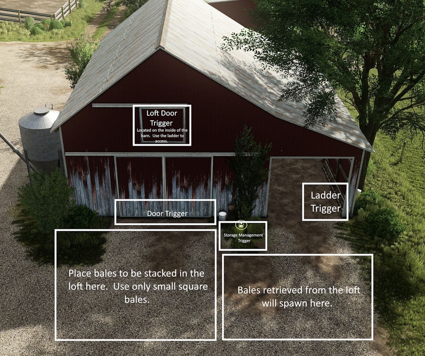 Mlýnek/míchačka, která je součástí mapy, je přizpůsobena požadavkům na krmivo pro prasata v okrese Ray a pro správnou funkci na této mapě nemusíte nic stahovat. Pokud byste chtěli používat mlýnek/míchačku na standardních mapách, které nemají vlastní krmivo, podívejte se v příštích několika týdnech na modifikace Green Acres.