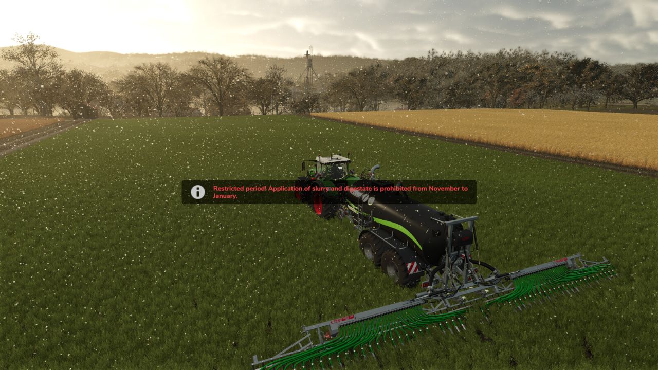 Pokud se hráč pokusí zapnout cisternu na kejdu nebo rozmetadlo hnoje během omezeného období, akce je zablokována a na obrazovce se zobrazí varovná zpráva (např. „Omezené období!“ nebo „Zemní mráz!“).