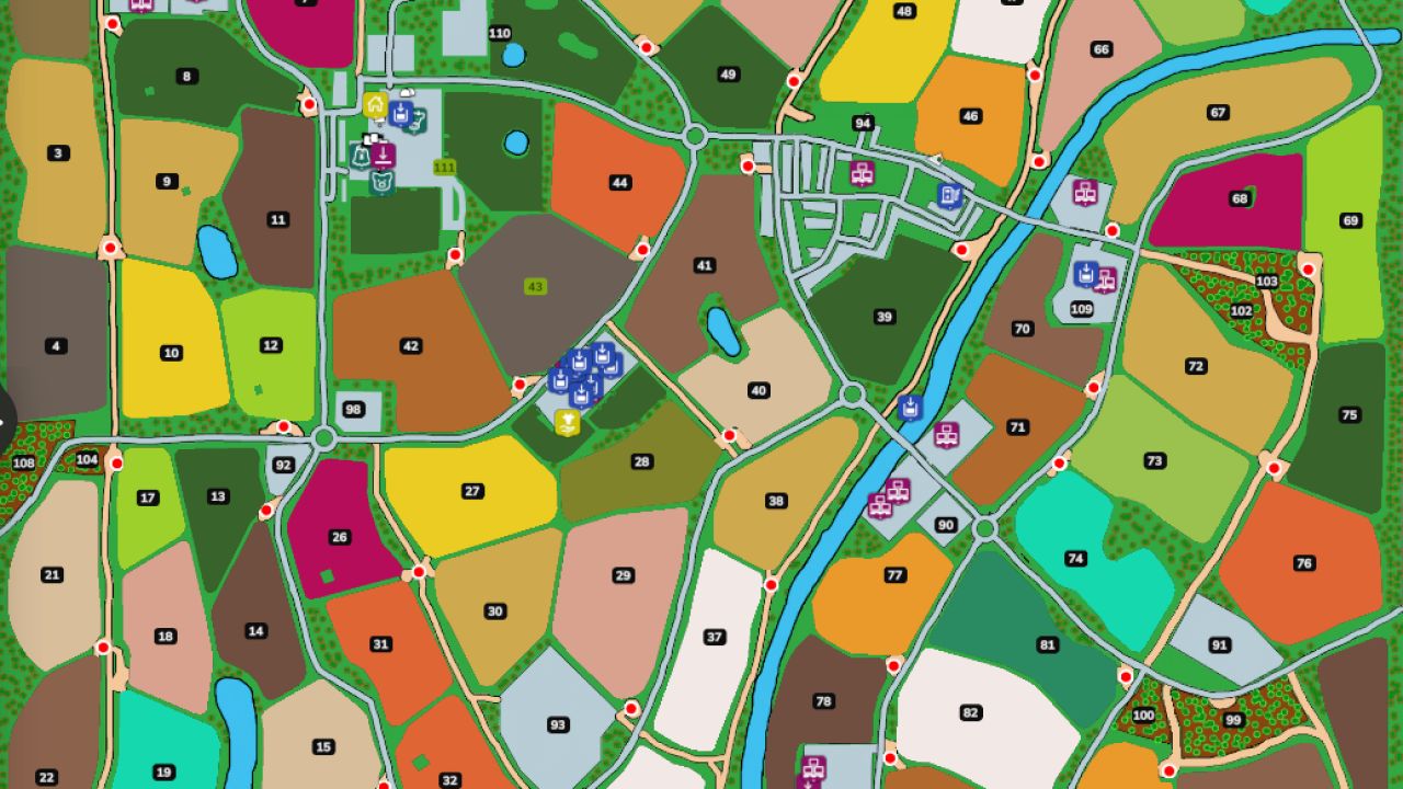 Několik pozemků pro vytvoření vašich farem nebo umístění vašich továren (celkem 9) (na mapě žádné továrny nejsou, nechávám vás na vaší fantazii).