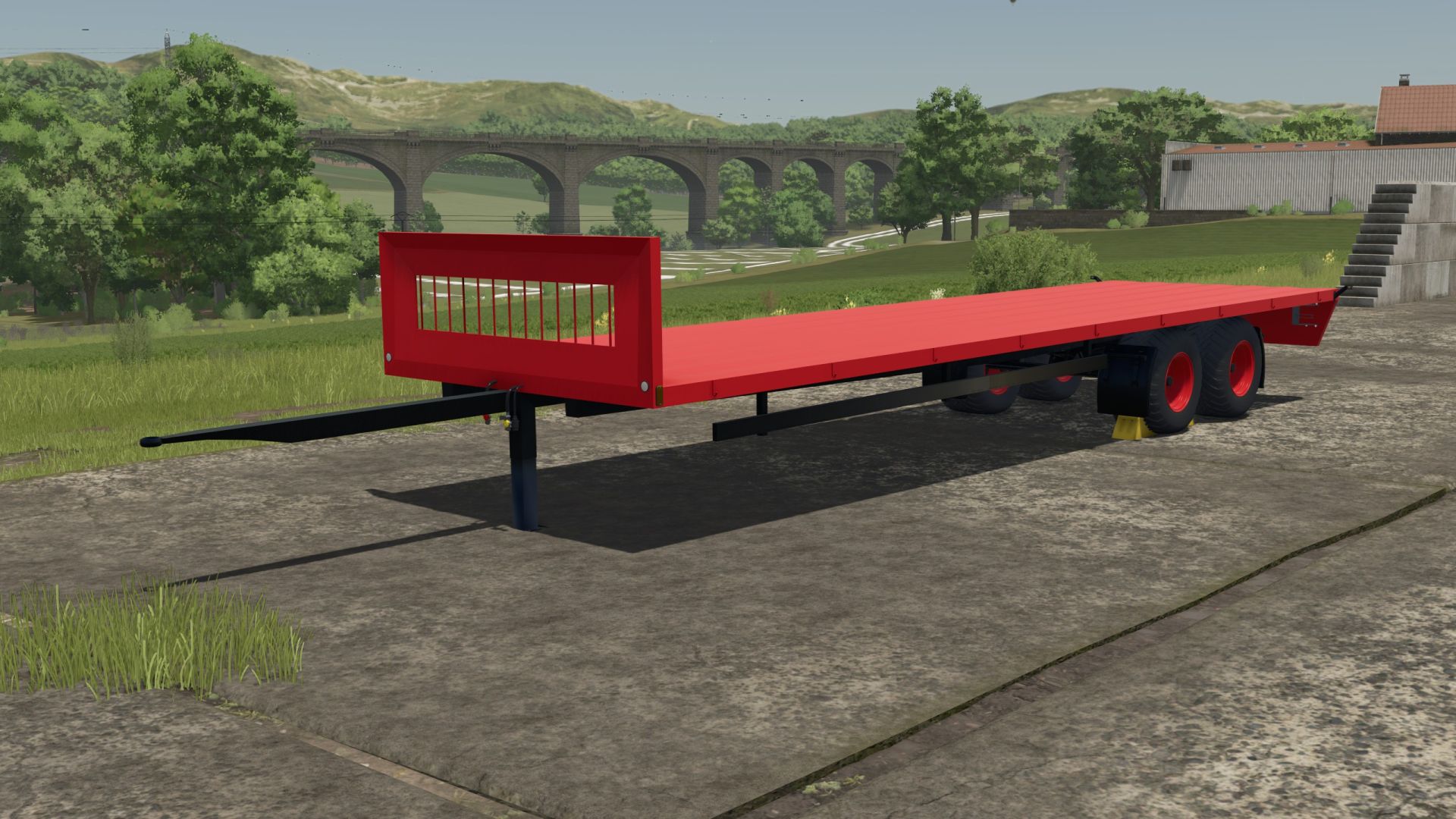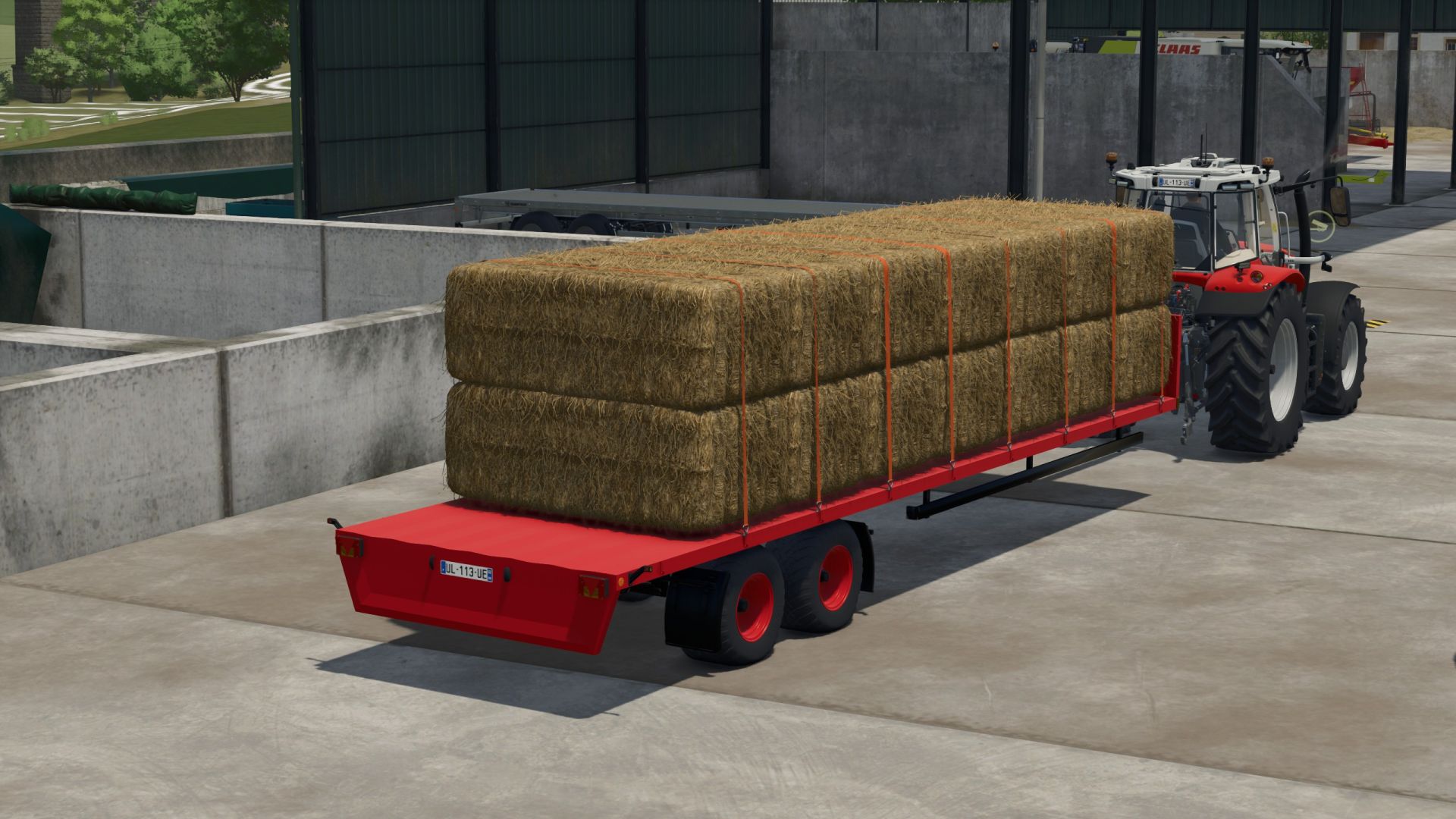 Přívěs s plošinou, ideální pro sběr balíků. Funguje s univerzálním automatickým nakládáním.