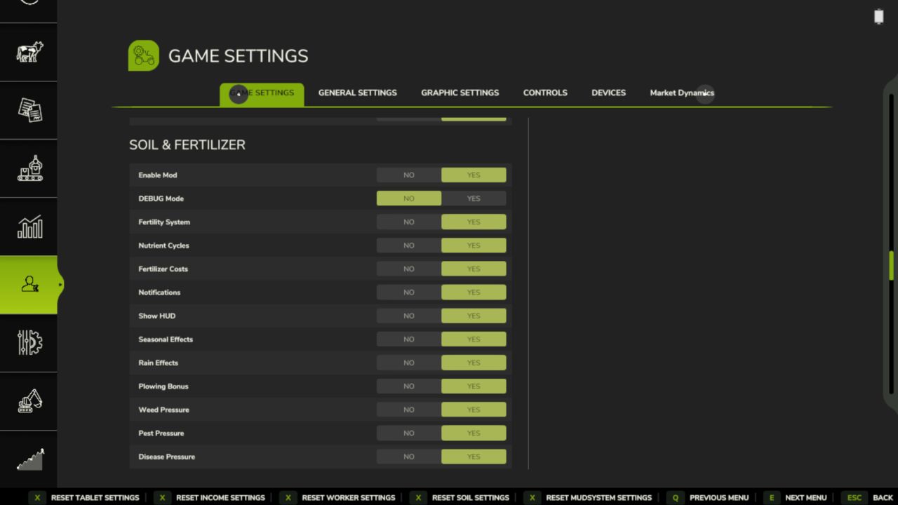 Všechna nastavení jsou ve hře v sekci Půda a hnojiva v herním menu. V režimu pro více hráčů je nastavení hry řízeno administrátorem. Nastavení HUD/zobrazení je vždy individuální pro každého hráče.
