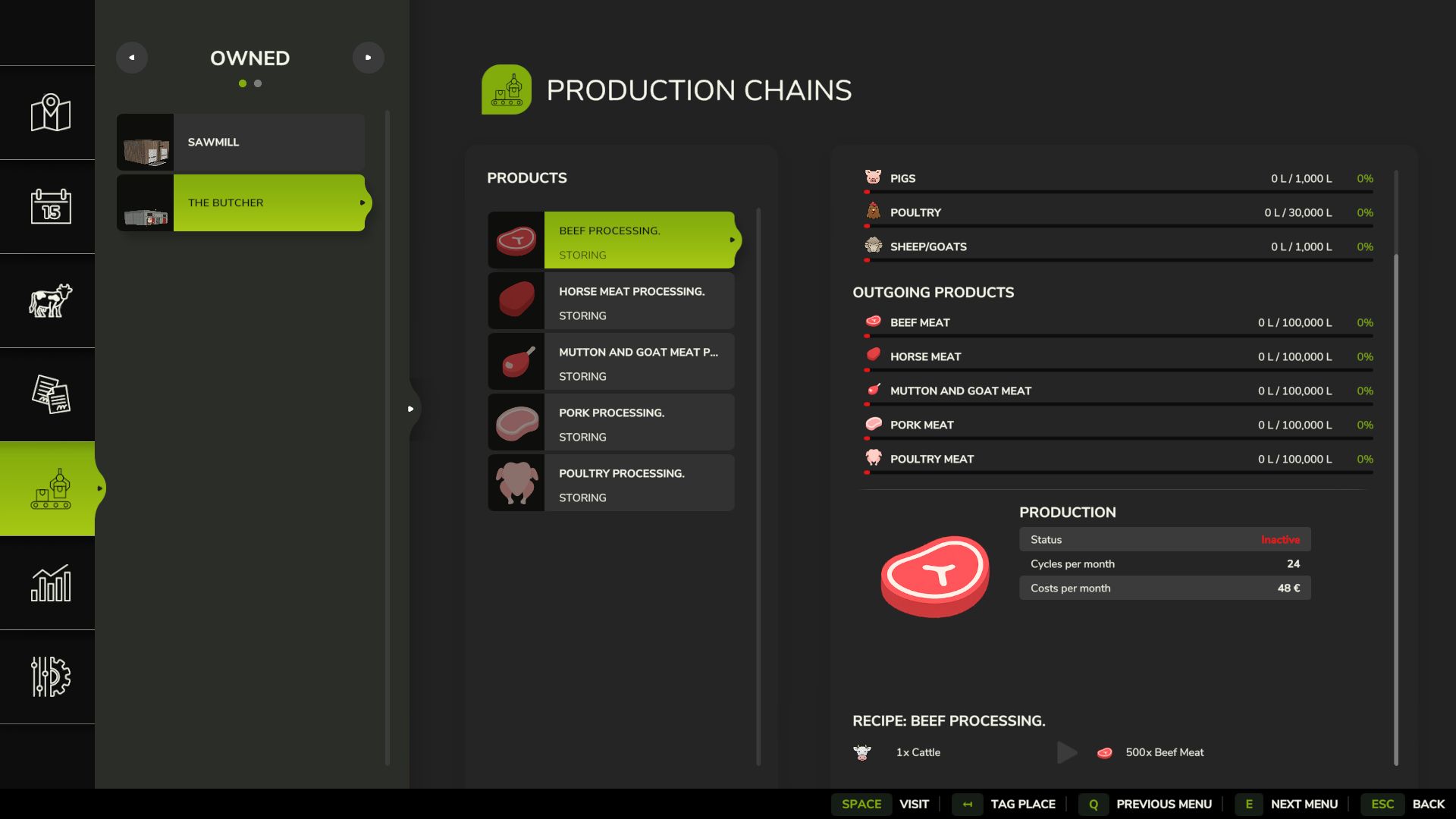 Řezník vyrábí masové palety z krav (buvolí maso se nedoporučuje), prasat, koní, kuřat a ovcí/koz. Množství zvířat se vypočítává přibližně na 1 tunu na paletu, přičemž porážkový věk se odvíjí od doby březosti.
