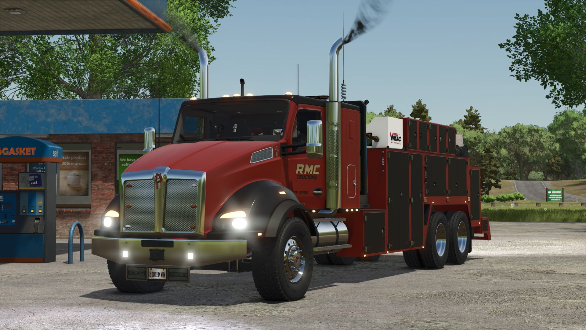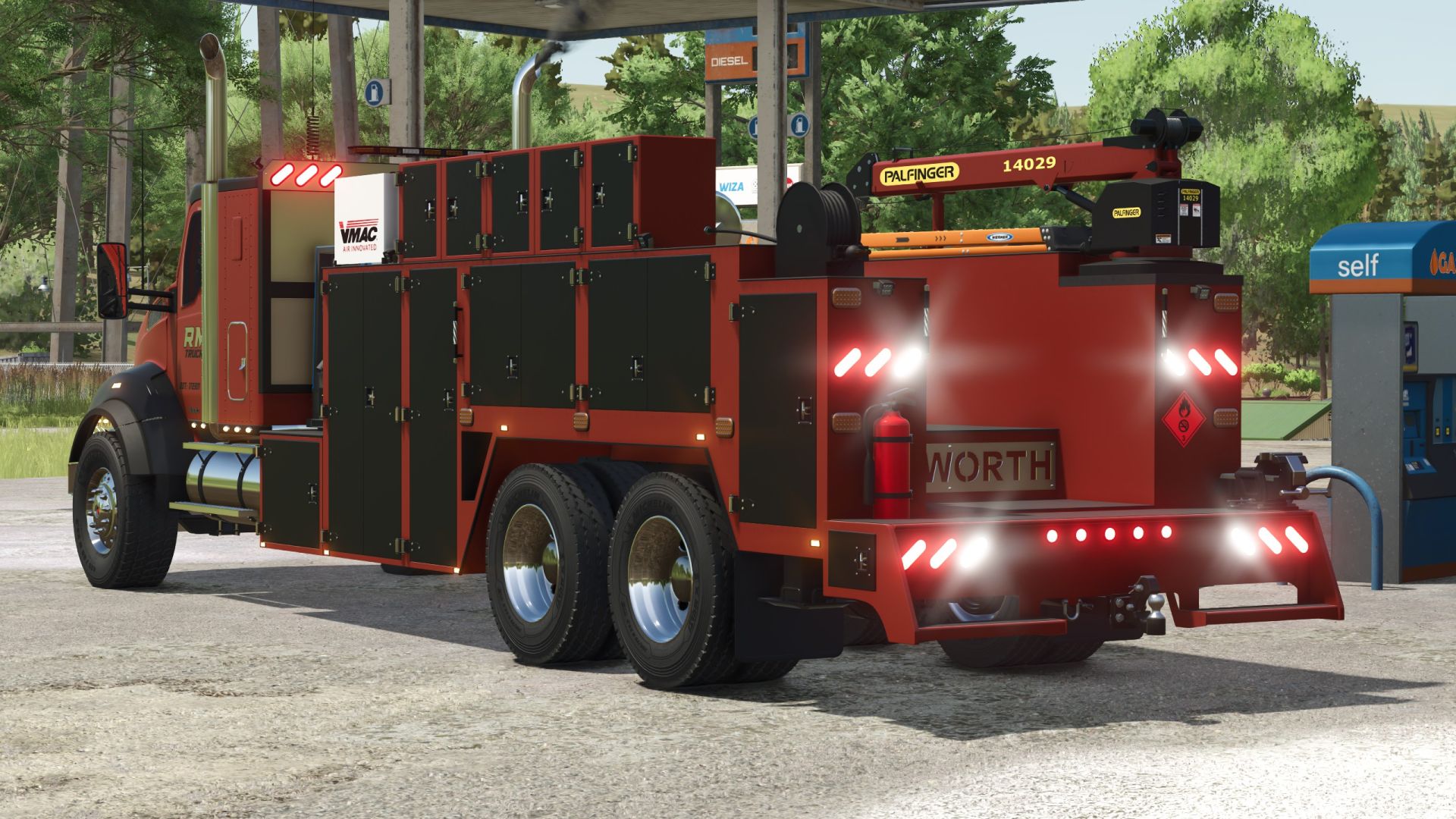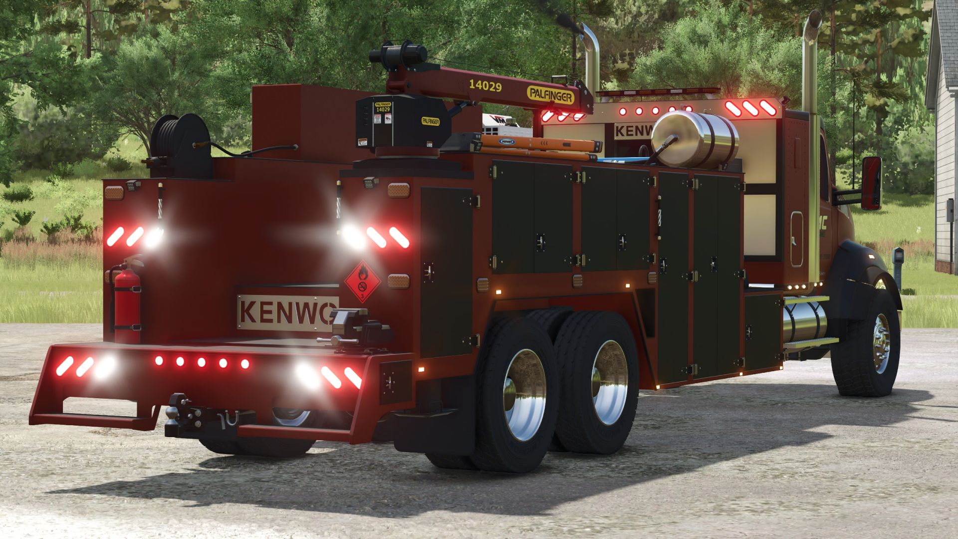 Asistenční vůz Kenworth T880 s funkčním pracovním jeřábem. Jeřáb používá pro kabelové vedení skript Betterwinch.