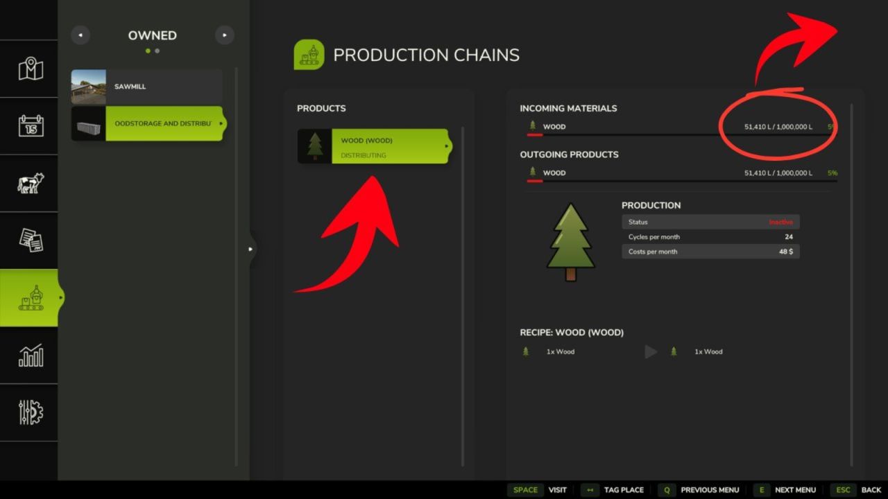 Kromě toho je možné skladované dřevo prodat. Chcete-li to provést, nastavte výrobní řetězec na „Prodej“.
