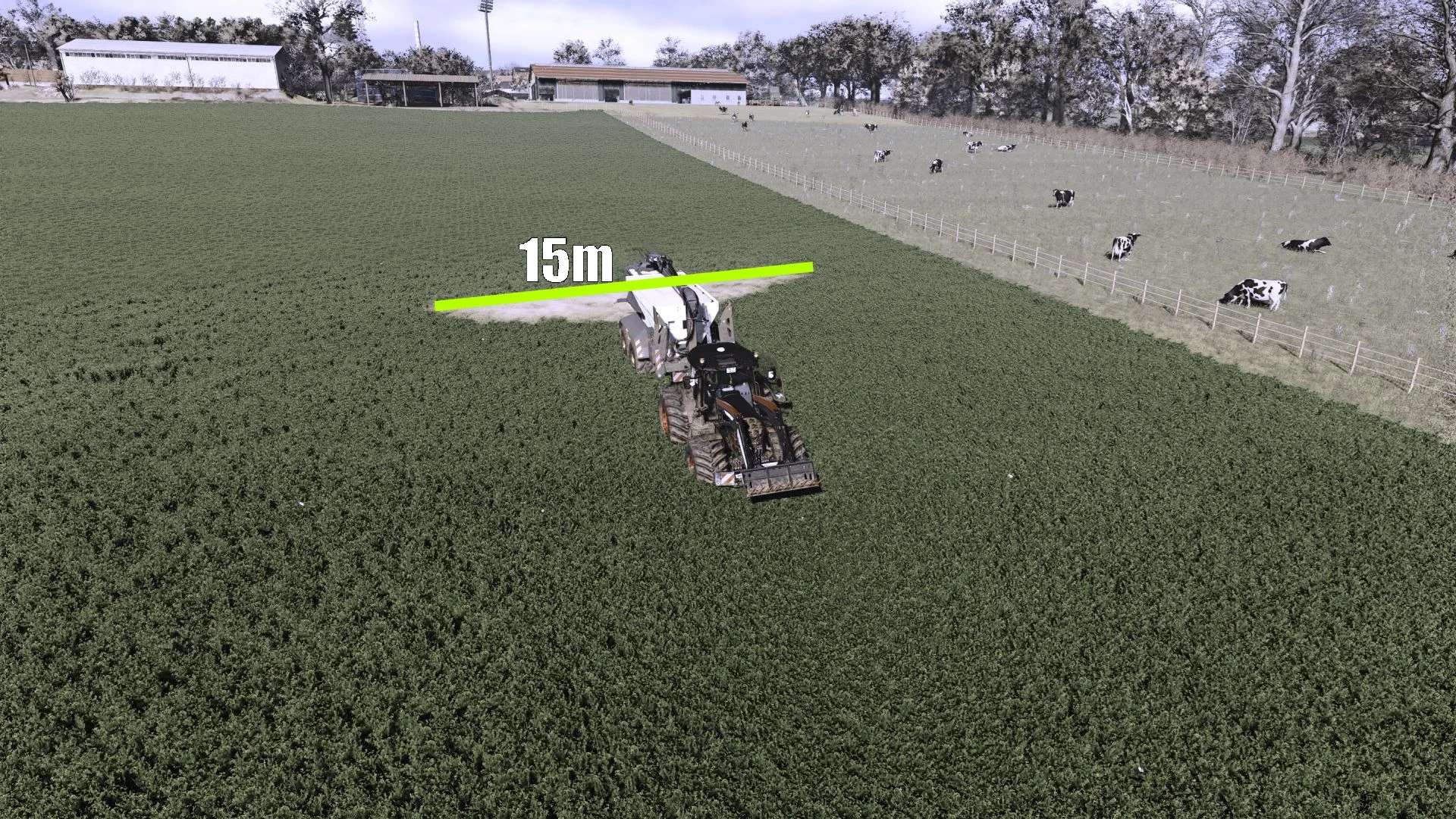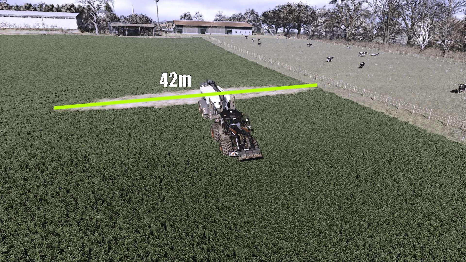 Pracovní záběr: 15 m–42 m (rozmetání vápna bylo prodlouženo z 15 m na 42 m s mezilehlými změnami záběru)