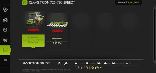 FS25 Balíčky September 14, 2025 by FS22mods · Published September 14, 2025 · Last modified September 13, 2025 CLAAS TRION 720-750 Speedy v1.5.0.0