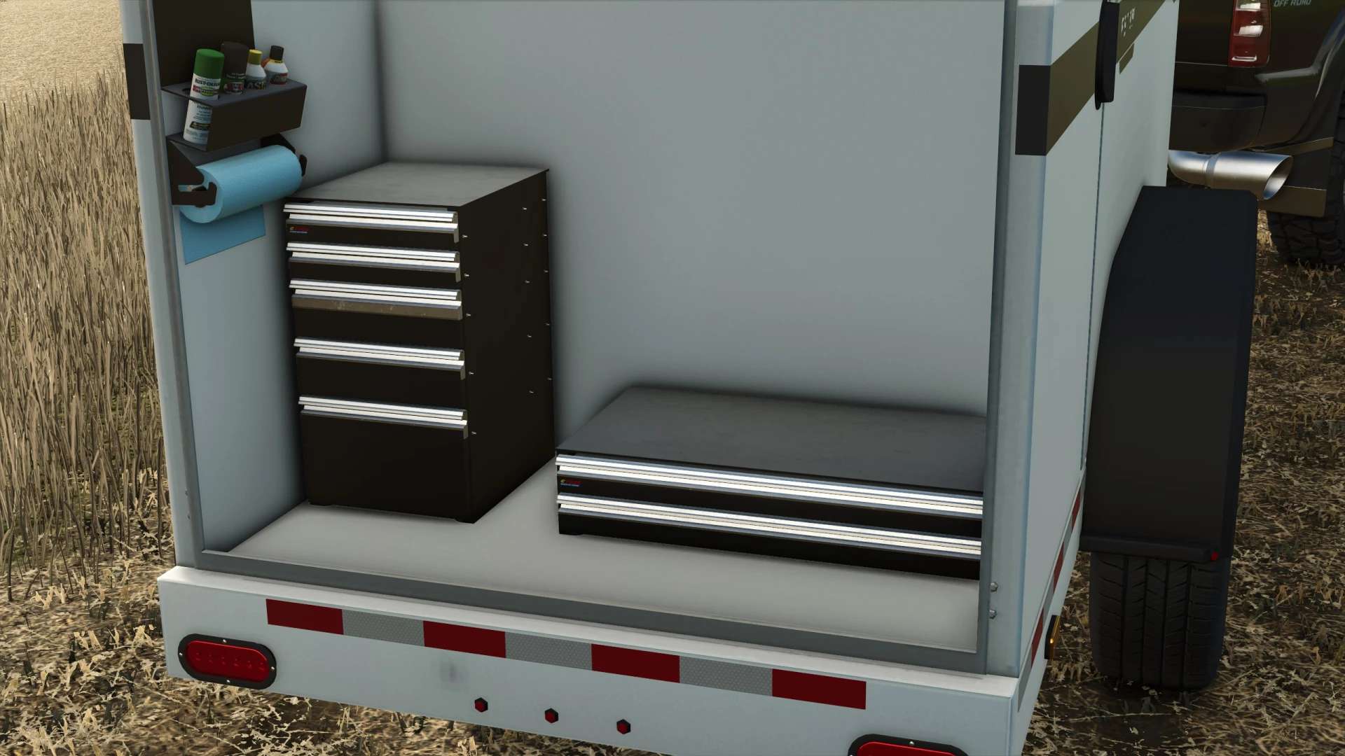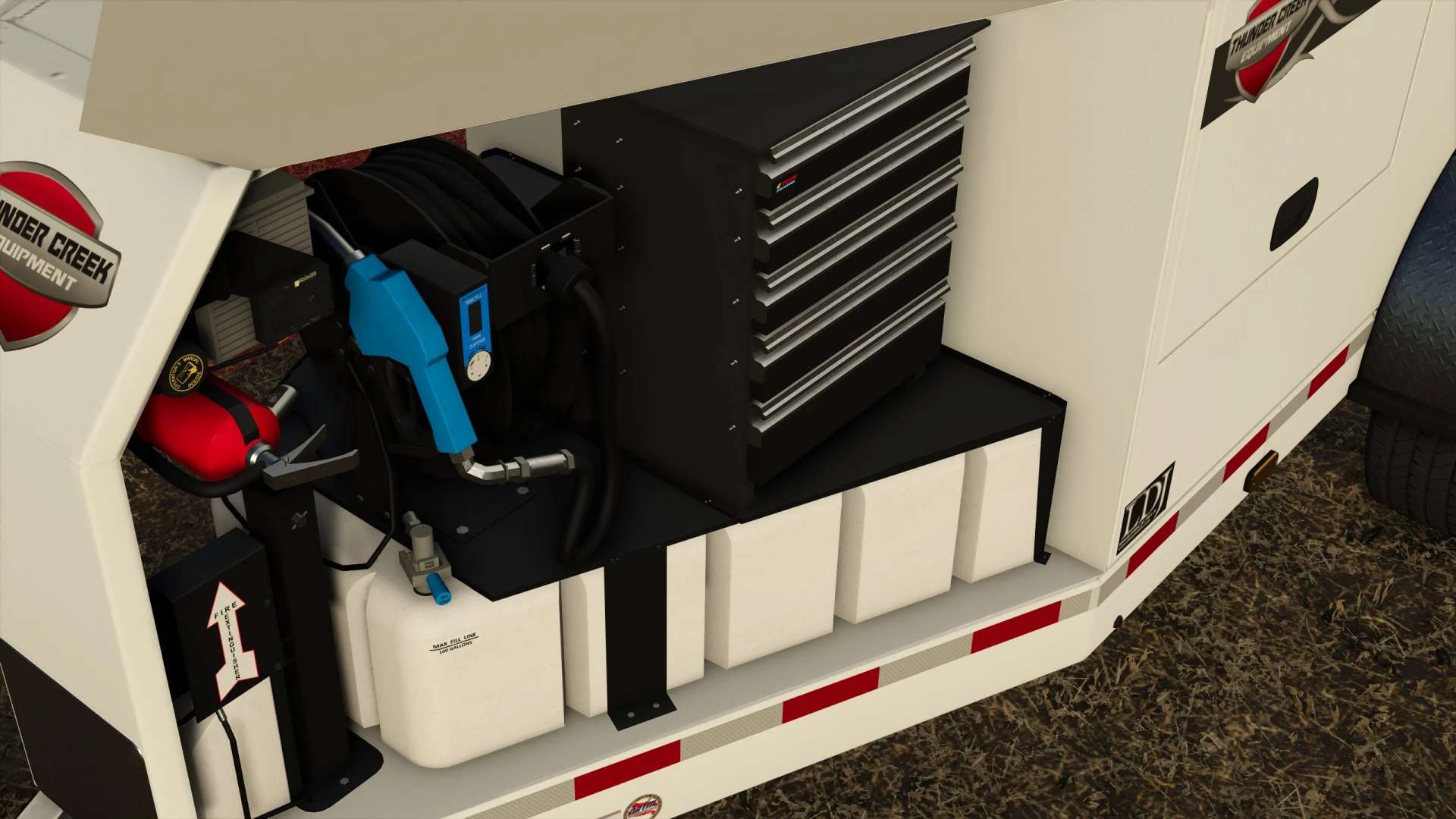 Thunder Creek FST990 s barevnými variantami a spoustou dalších detailů. Tento přívěs je kompletně detailně propracovaný zevnitř i zvenku! Má servisní funkci a funkci tankování paliva (upozorňujeme, že pro tankování je nutné zapnout motor, umístění viz obrázek).